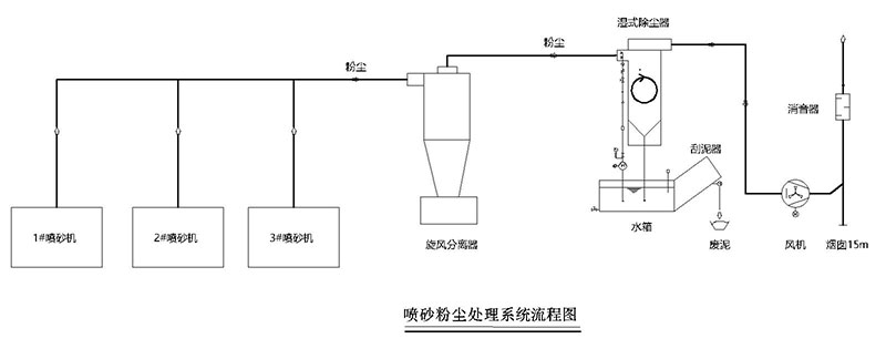 综合以上喷砂行业粉尘处理难点和痛点,科朗兹采用粉尘处理工艺设计为:1-针对不同型号和样式的喷砂机,设计相对应的吸风罩进行前端粉尘捕集,保证收集效率在95%以上;2-喷砂粉尘通过管路输送到旋风分离器进行初效过滤,可以有效预过滤50%以上直径>10um大颗粒物,起到初级过滤作用;3-剩余细小颗粒物进入高效文丘里湿式除尘器进行分离,在喷淋水的作用下变成泥浆,流入设备底部水箱,自动刮泥系统全自动运行,人员定期将污泥送至处理站处理即可;4-处理完的干净气体在引风机的作用下通过15m烟囱进行高空排放。
