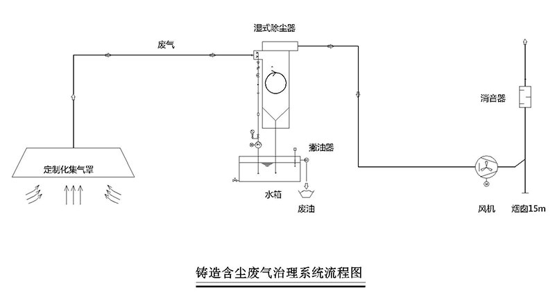 解决以上问题的关键点在于铸造过程中释放高温,粉尘上升速度很快,释放大量的重金属粉尘和废气,需要定制化设计耐高温集气罩并且集气罩要完全覆盖高温烟尘扩散区域,风速设计合理这样才能捕集95%以上的粉尘,含尘废气通过管道被输送到新源文丘里湿式除尘器中,含尘废气与水充分接触,通过文丘里特有的结构充分和水接触吸收、去除其中大部分颗粒污染物及部分异味,处理后的气体可以通过室外烟囱直接排放到大气中。